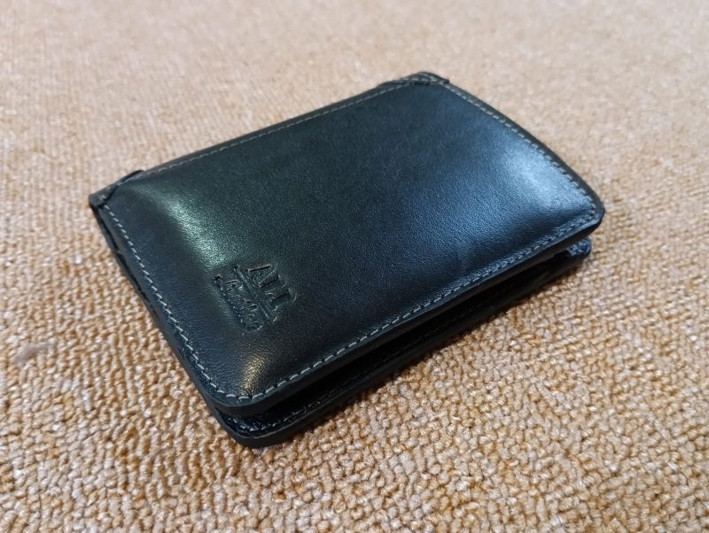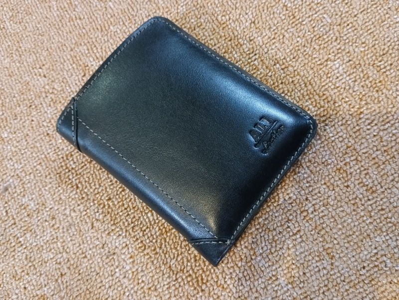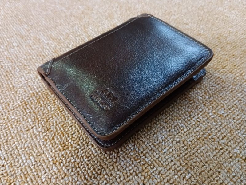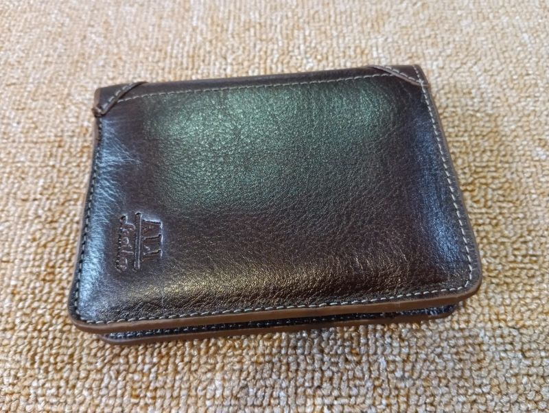 Leather wallet with multiple pockets and chambers.